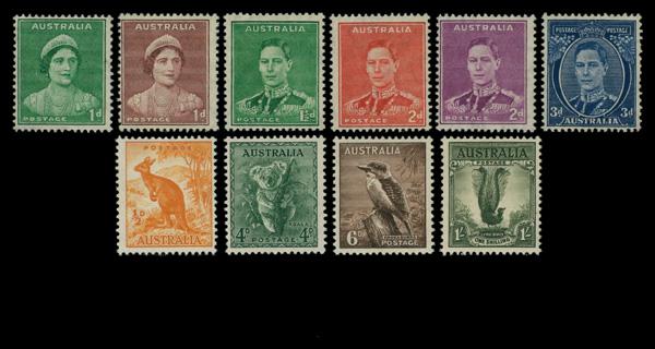 1942, Australia 1937 King George and Queen Elizabeth pictorial variations (Scott 180-183, 223A,293,295,300), singles, o.g., never hinged, Very Fine, includesstanley Gibons 230d. SG 180,181,183,184,185,186,228,230a,230b; £88 ($110). Scott $84. (Image)