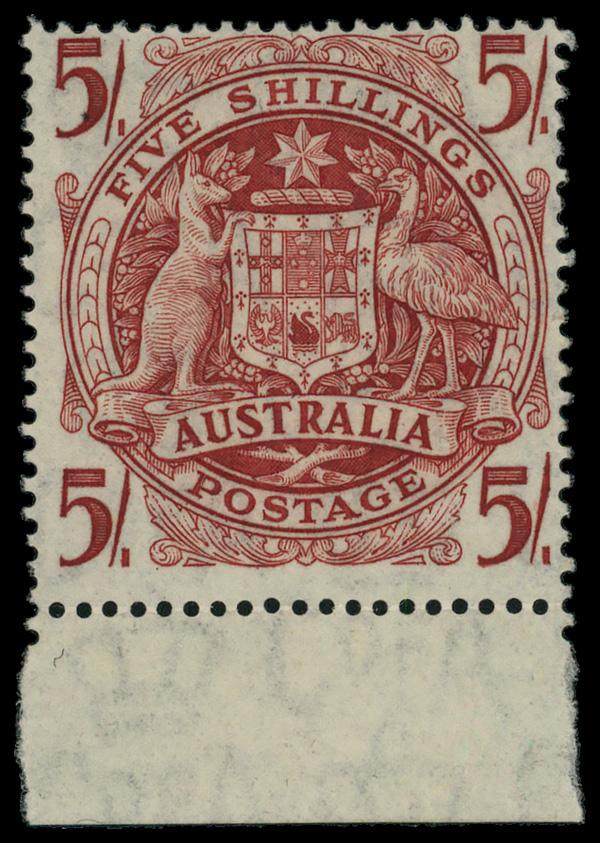 1949, 5s Arms, Thin Paper (Scott 218), single, o.g., never hinged, Very Fine. SG 224a; £110 ($140). (Image)