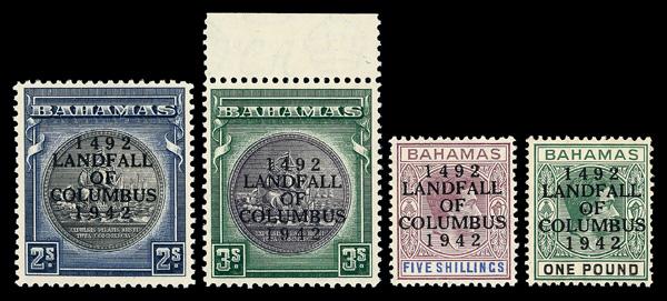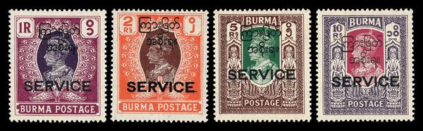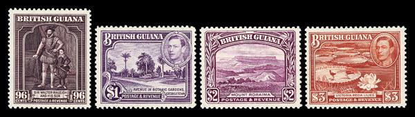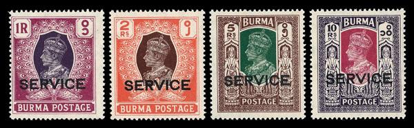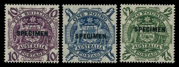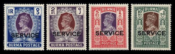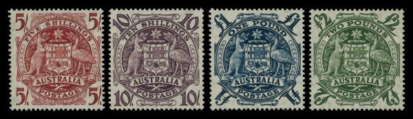 1949-50, 10s-£2 Arms complete, overprinted "Specimen" (Scott 218-221), complete set of singles, o.g., never hinged, Very Fine. SG 224bs/ds; £160 ($200). (Image)