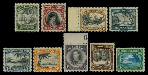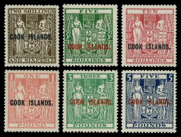 1943-1954, New Zealand Postal Fiscal stamps overprinted Cook Island (Scott 124A-126C), complete set of singles, o.g., never hinged, Very Fine. SG 131w/136w; £550 ($700). Scott $575. (Image)