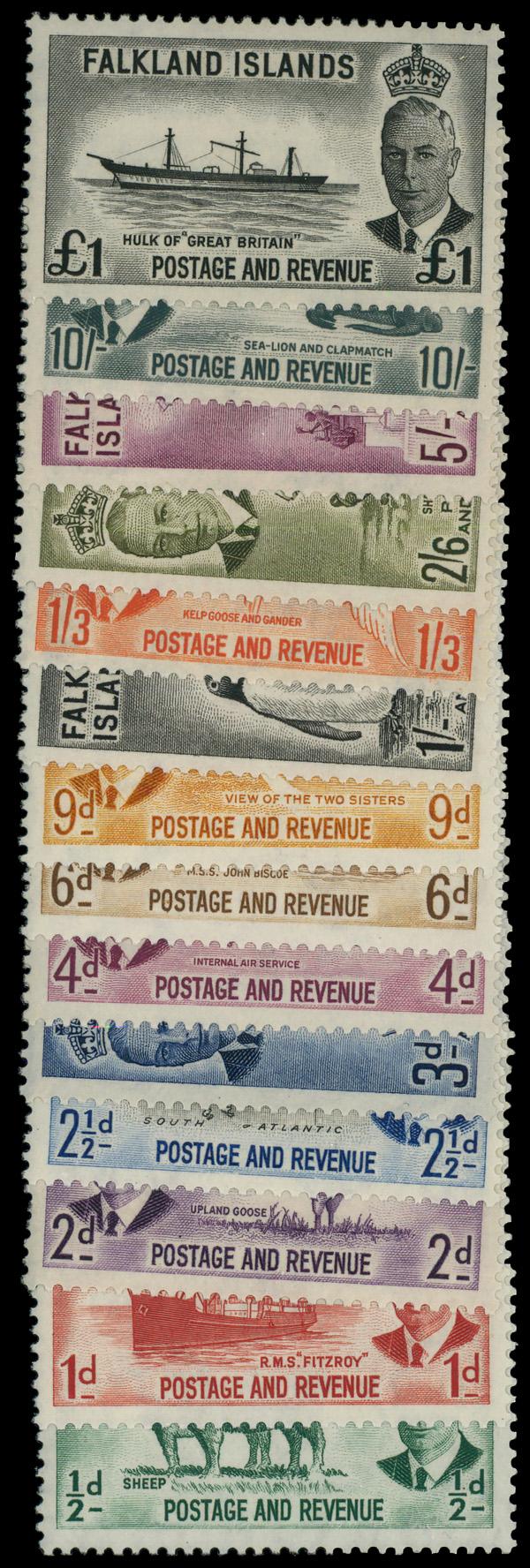 1938-51, King George VI Pictorials, ¼pi to £1 complete (Scott 143-155), set of 16, complete set of singles, o.g., never hinged, Very Fine. SG 151/163; £232 ($300). Scott $265. (Image)
