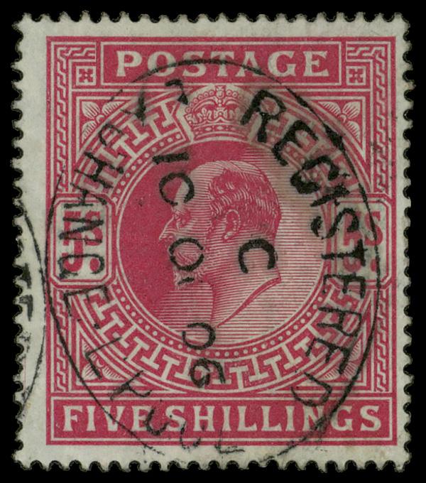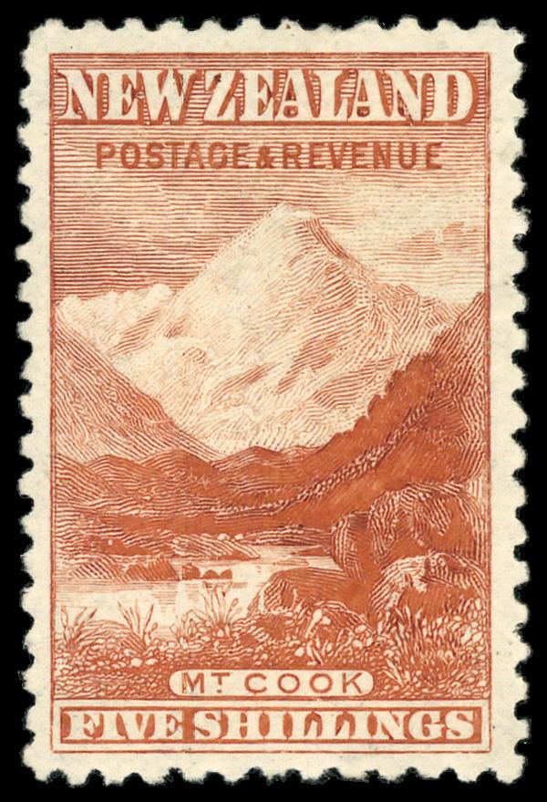 1899, Mt. Cook, 5s vermilion, perf 11¼ (Scott 98), unwatermarked, disturbed o.g., Fine to Very Fine, with 1981 R.P.S.L. certificate. SG 270. Scott $300. (Image)