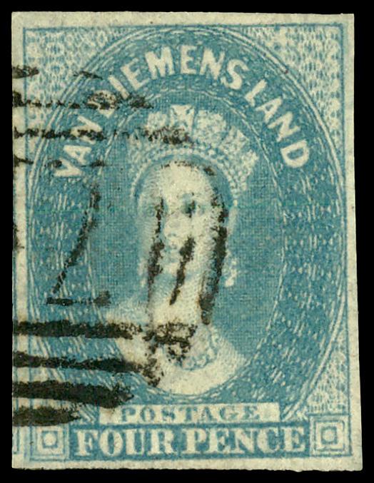1857, "Van Diemen's Land", 4d pale blue, imperf. (Scott 13), Double-lined Numeral watermark, single, Fine to Very Fine, Inverted water mark. SG 36; £26 ($30). Scott $30. (Image)