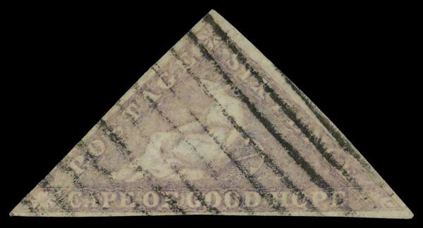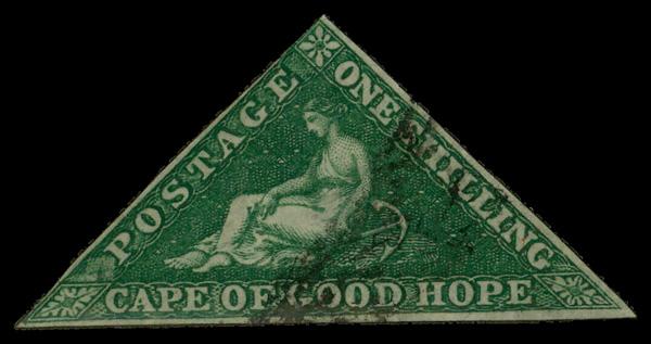 1858, Triangular, Perkins Bacon printing, 1s deep dark green on white paper (Scott 6a), Very Good to Fine. SG 8b. Scott $600. (Image)