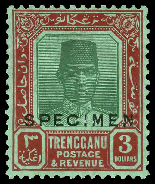 1925, Sultan Badaru'l-alam, $3 red & green on emeral paper, over printed Specimen (Scott 37), single, o.g., lightly hinged, Fine to Very Fine. Scott $80. (Image)