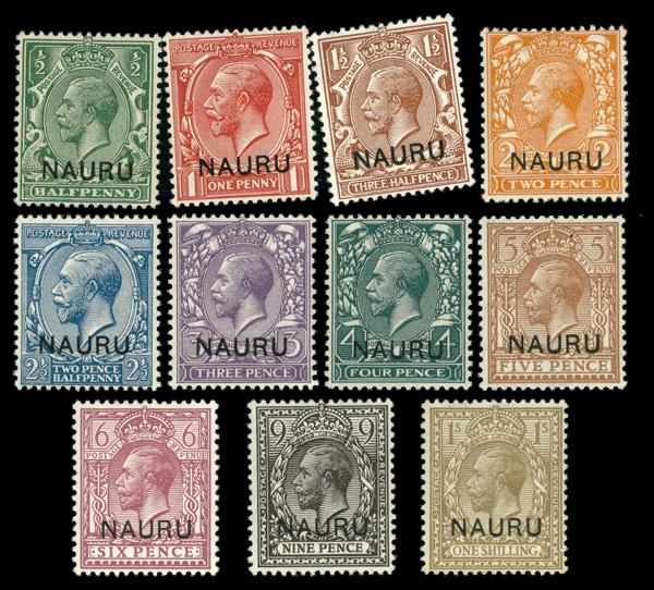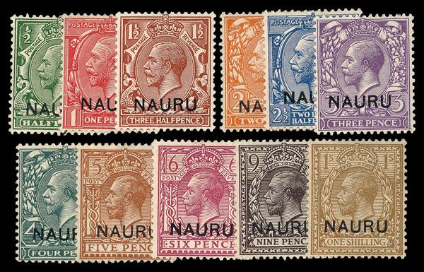 1916, George V stamps of Great Britain overprinted Nauru complete (Scott 1-12/1d-4d), complete set of singles, o.g., lightly hinged, Fine to Very Fine. Scott $192. (Image)