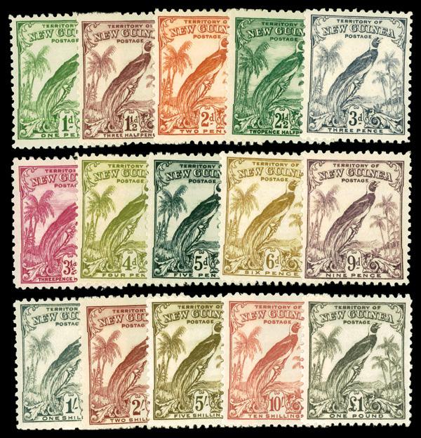 1932-34, Bird of Paradise (without dates), 1d to £1 complete (Scott 31-45), complete set of singles, o.g., lightly hinged, Fine to Very Fine. SG 177/89; £250 ($320). Scott $310. (Image)