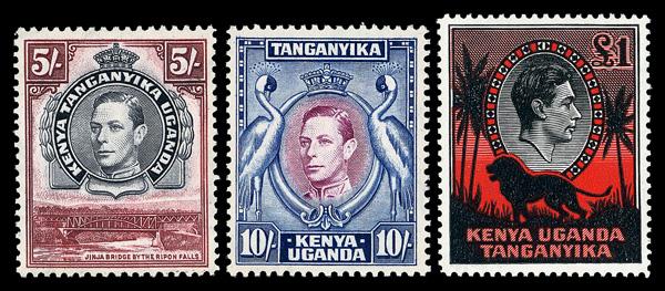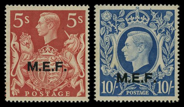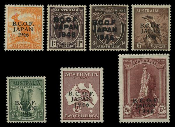 B.C.O.F., 1946-47, ½d to 5s complete (Scott M1-M6,M7a), complete set of singles, o.g., never hinged, Very Fine. SG J1-7; £190 ($240). Scott $284. (Image)
