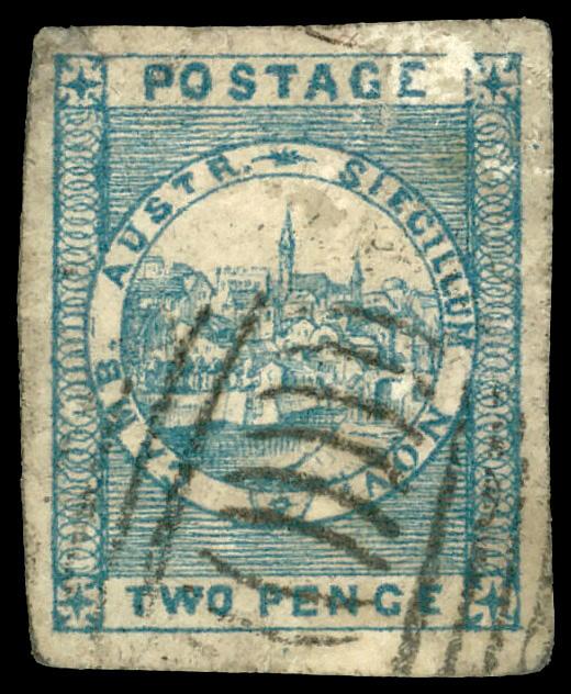 1851, Sydney View, 2d dull blue, plate V, wove paper (Scott 8), single, Fine to Very Fine, Facial scuff top right. SG 37; £180 ($230). Scott $270. (Image)