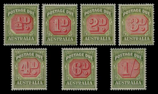 Postage Dues, 1938-39, ½d-1s complete (Scott J64-J70), complete set of singles, o.g., hinged once, Fine to Very Fine. SG D112-118; £200 ($250). Scott $257. (Image)