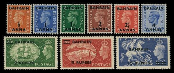 1950, Great Britain 272-80, Overprinted in Annas and Rupees (Scott 72-80), complete set of singles, o.g., never hinged, Very Fine. SG 71/79; £110 ($140). Scott $126. (Image)