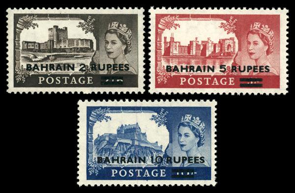 1955, Great Britain 2r-10r 'BAHRAIN' overprint (Scott 96-98), o.g., never hinged, Very Fine to Extremely Fine. Scott $37. (Image)