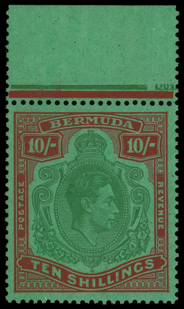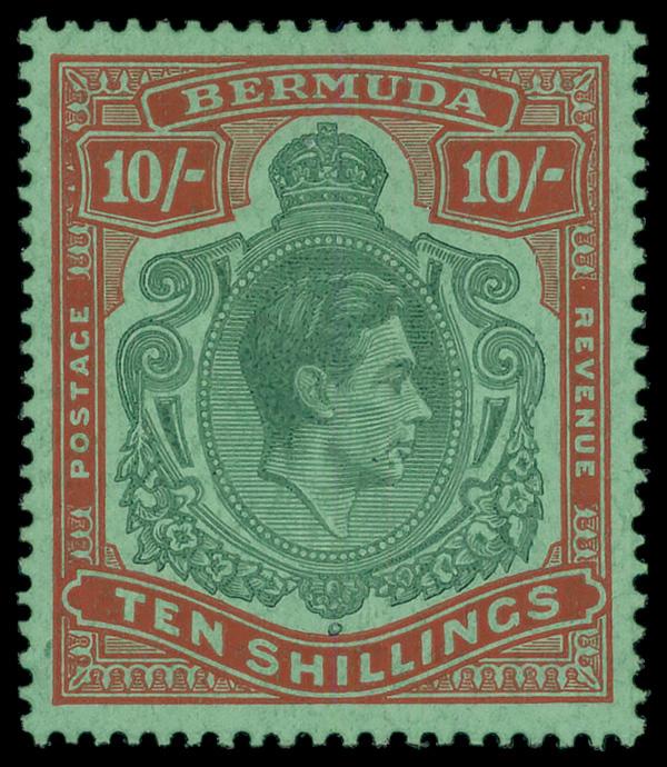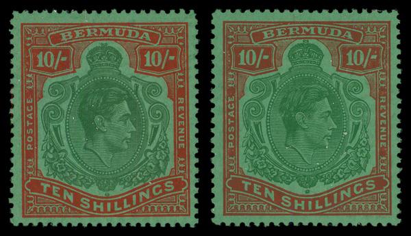 1953, King George VI, 10s green & dull red on green, perf. 13 (Scott 126), 2 singles, o.g., never hinged, Very Fine. SG 119f; £98 ($120). Scott $80. (Image)