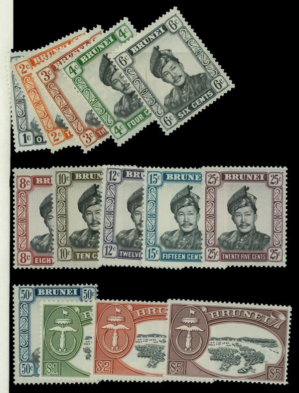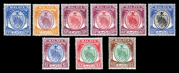 1949, Arms of Sembilan 1¢ through $5 (Scott 38-58), complete set of singles, o.g., never hinged, Very Fine. SG 42/62; £130 ($160). Scott $126. (Image)