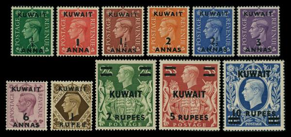 1948, King George VI regular issue overprinted Kuwait with new values ½a through 10r (Scott 72-81A), complete set of singles, o.g., never hinged, Very Fine. SG 64/73a; £100 ($130). Scott $186. (Image)