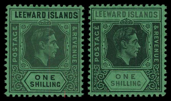 1942, King George VI, 1s black on emerald varieties (Scott 111var), singles, Very nice addition to any collection, Stanley Gibbons 110ba and 110bb varieties of grey/black and black/grey on emerald paper., o.g., never hinged, Very Fine. SG 110b; £154 ($200). (Image)