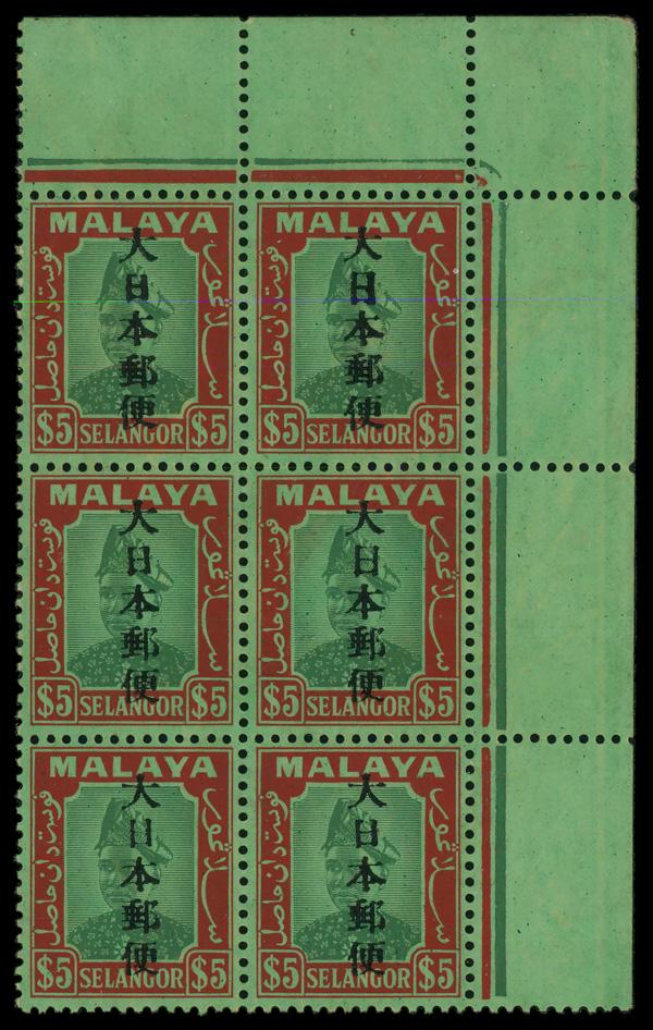 1943, Sultan Hisamud-din Alam Shah $5 overprinted (Scott N42), top right block of 6, o.g., never hinged, Very Fine. SG J287; £88 ($110). Scott $300. (Image)