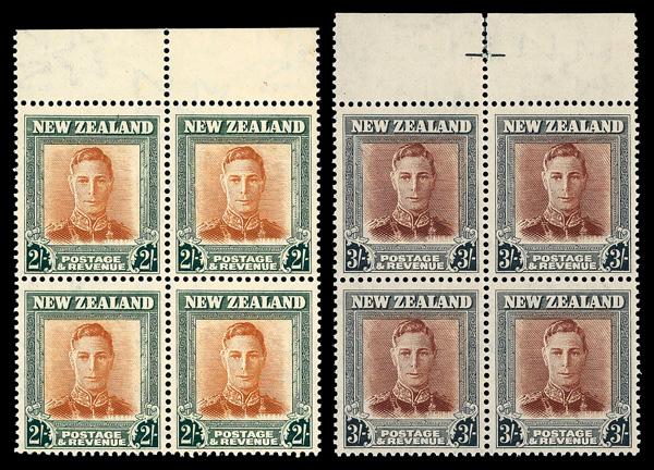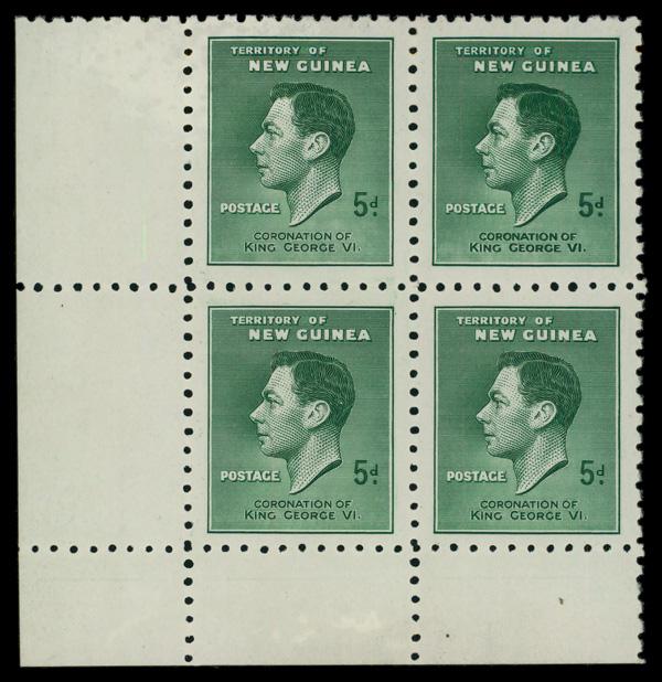 1937, 5d Coronation (Scott 50), bottom right corner block of 4, Great example of a major re-enrty of Stanley Gibbons 210e top right stamp of the block., o.g., never hinged, Very Fine. SG 210; £75 ($100). Scott $96. (Image)
