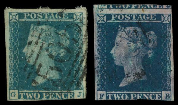 1841, Queen Victoria, 2d blue & 2d deep bright blue, "white lines" (Scott 4 & 4b), Very Good to Fine. SG 14. Scott $215. (Image)