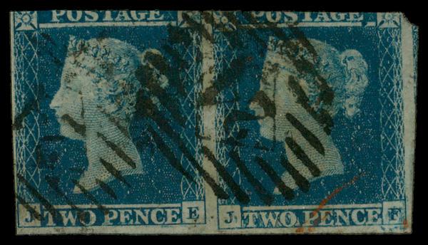 1841, 2d blue, "white lines" (Scott 4), pair, Very Good. SG 14. Scott $325. (Image)