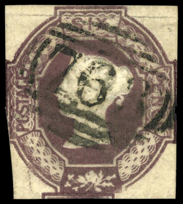 1854, Queen Victoria (embossed), 6d purple (Scott 7); pinhole, Very Good to Fine. SG 60. Scott $1,000. (Image)
