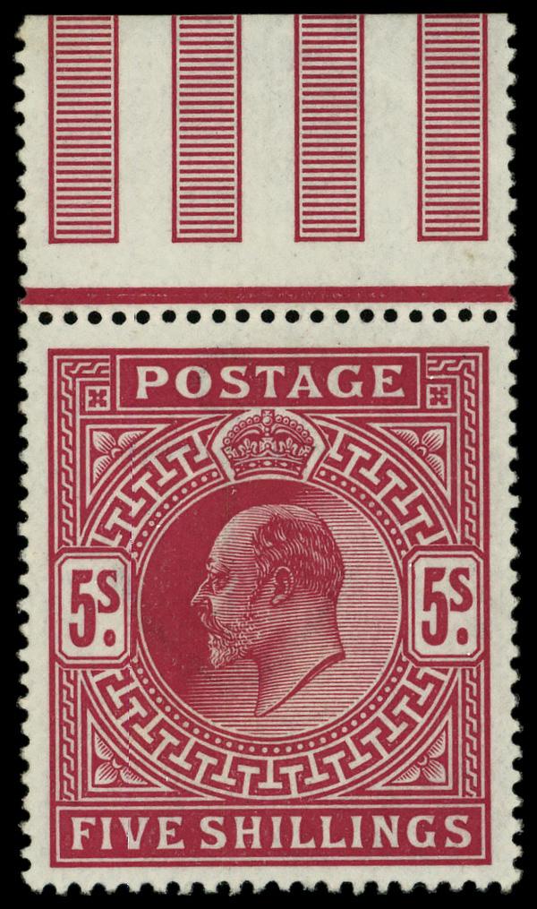 1902, King Edward VII, De La Rue printing, 5s bright carmine (Scott 140), o.g., never hinged, Very Fine to Extremely Fine. SG 263. Scott $975. (Image)