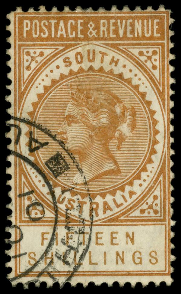 1886, Queen Victoria "Postage & Revenue" high value, 15s brownish yellow, perf 11½-12½ (Scott 84), Fine. SG 198a. Scott $275. (Image)