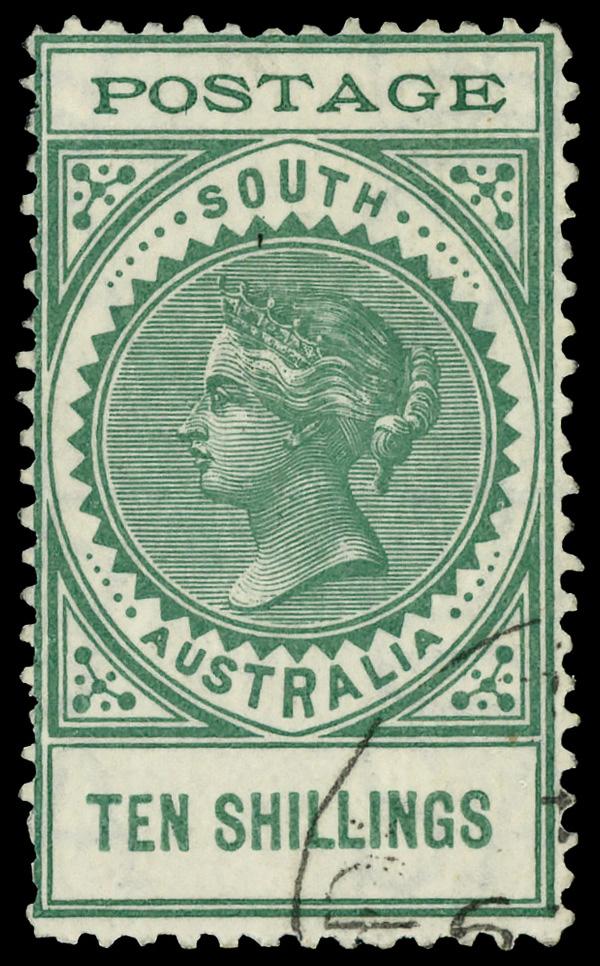 1902, Queen Victoria (thin "POSTAGE"), 10s green, perf 11½-12½ (Scott 130), Crown and SA (close) watermark, Fine. SG 278. Scott $100. (Image)