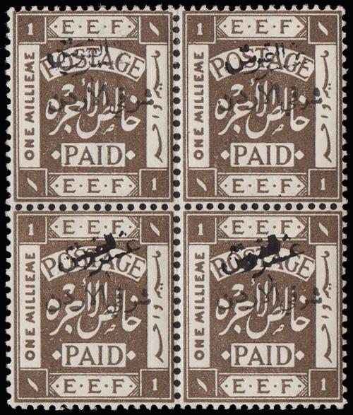 1922, 1/10pi on 1m sepia, perf 15x14, black surcharge (Scott 13), block of 4, o.g., bottom stamps never hinged; some separation, Very Fine. SG 20; £128+ ($160). Scott $130+. (Image)