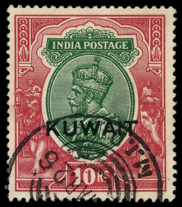 1923, India 10r carmine & green 'KUWAIT' overprint (Scott 15), wmk 39 star, Very Fine to Extremely Fine. Scott $600. (Image)