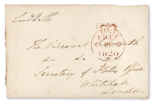 1820 (Dec. 7), Cover front from Lord Bath to Viscount Sidmouth, with a return address of simply "Lord Bath" (peerage has its privileges), a cover front addressed to The Viscount Sidmouth at "Secretary of States Office, Whitehall, London"; faint "FROME" straightline postmark with mileage (110?) below, partly overstruck by red single-ring (morning service) Crowned Circle "Free/7 DE 7/1820" postmark; Bath (Thomas Thynne, 2nd Marquess of Bath, 1765-1837) was at the time Lord Lieutenant of Somerset; Viscount Sidmouth (Henry Addington, 1757-1844) had previously served as Prime Minister 1801-04 and was then Secretary of State, Very Fine. (Image)