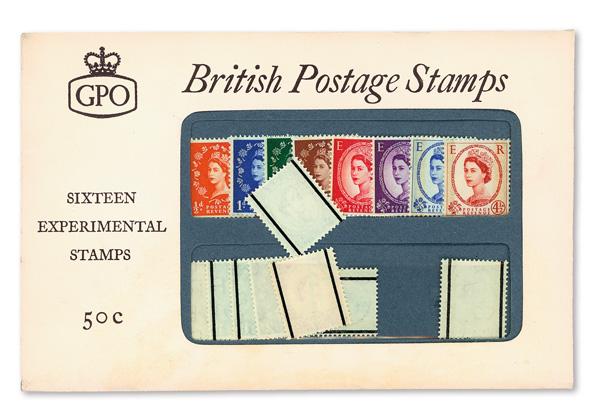 1960, ½d-4½d Wildings, experimental phosphor-graphite issue, Special Presentation Pack, envelope unopened, containing 16 experimental stamps never hinged, inscribed "50c" for sale in the US; back of envelope missing "Corrections" sticker usually found, which corrected information regarding watermarks on the ½d, 1d and 1½d stamps, Very Fine. SG SPP2b var.; £300 ($380). (Image)