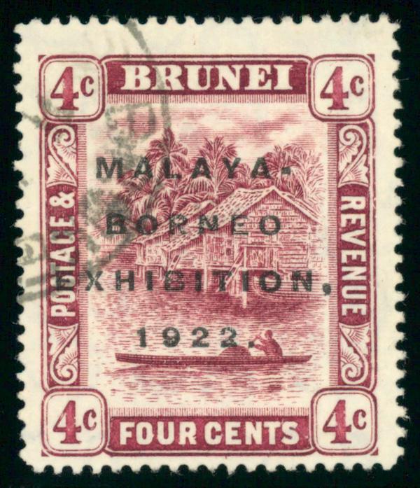 1922, 4c claret Malaya-Borneo Exhibition overprint, broken 'N' of 'BORNEO' (Scott 20A), Fine to Very Fine. SG 54c; £80 ($110). (Image)