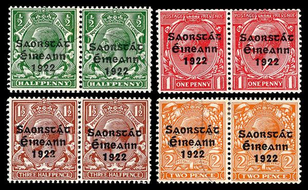 1923, Harrison Free State overprints on King George V coils, ½d to 2d complete (Scott 59-62), set of 4, paste-up pairs, o.g., lightly hinged or hinge remnant (1d small thin), Very Fine. SG 67/70. Scott $59. (Image)