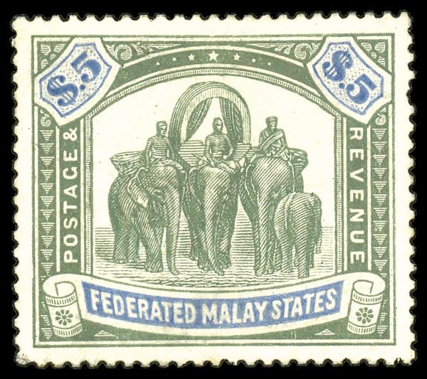 1904, Elephant and Howdah, $5 green and ultramarine (Scott 36), single, o.g., hinge remnant, Very Fine. Scott $325. (Image)