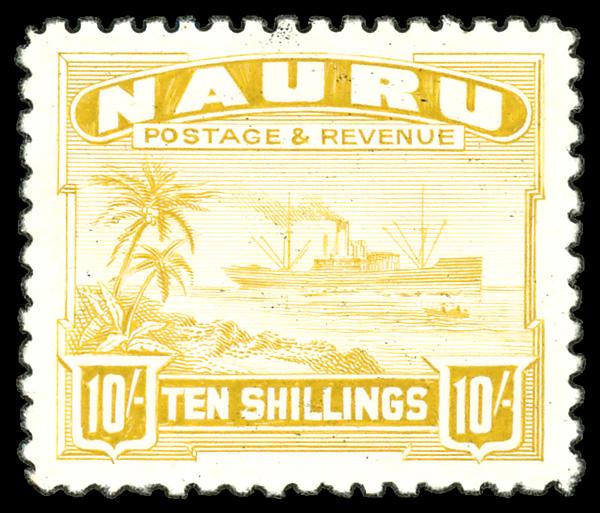1937, Freighter, 10s yellow, glazed surfaced white paper (Scott 30a), single, o.g., never hinged, Very Fine. SG 39B; £85 ($110). Scott $85. (Image)
