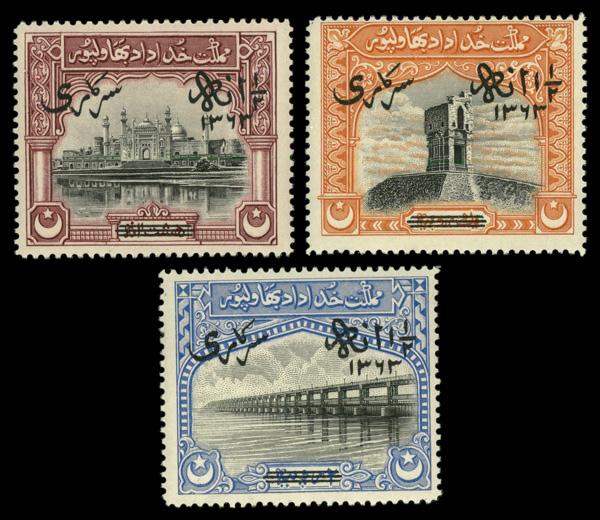 1945, Bahawalpur pictorials surcharge new values (Scott O7-O9), complete set of singles, o.g., lightly hinged, Very Fine. Scott $245. (Image)