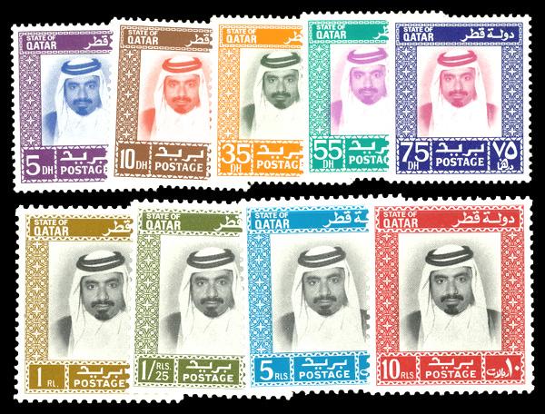 1972, Sheik Khalifa bin Hamad al Thani 9 values (Scott 290-291,292-298), complete set of singles, o.g., never hinged, Very Fine. Scott $145. (Image)