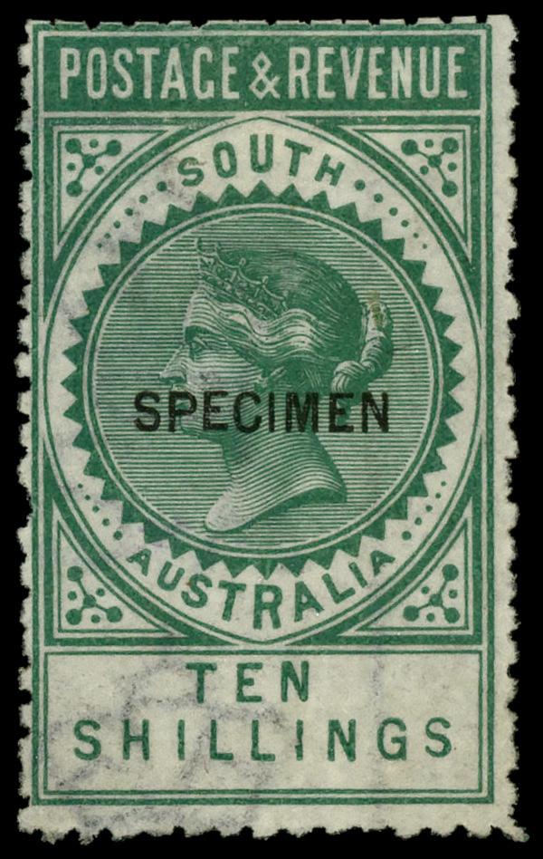 1886, Queen Victoria "Postage & Revenue" high value, 10s green, perf 11½-12½ 'SPECIMEN' overprint (Scott 83), o.g., hinge remnant, Fine. SG 197a. (Image)