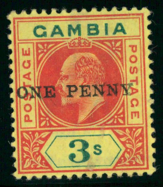 1906, King Edward VII, 1d on 3s carmine & green on yellow (Scott 66), o.g., lightly hinged, Very Fine. SG 70. Scott $60. (Image)