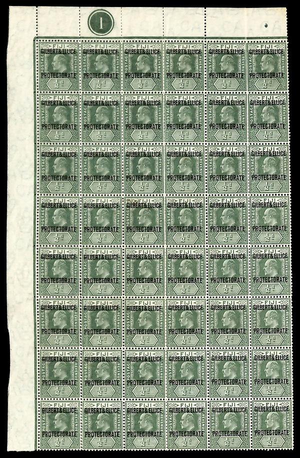 1911, "Protectorate" overprint on Fiji ½d green (Scott 1), plate block of 48 (perf separations & creases), unused without gum, Very Fine. SG 1. Scott $360. (Image)