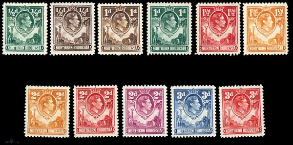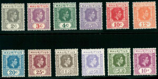 1938-49, King George VI, 2¢ to 10r complete (Scott 211-222), o.g., never hinged, Very Fine. SG 252/263a. Scott $127. (Image)