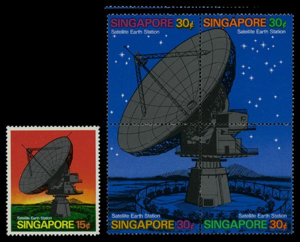 1971, Satellite Earth Station, Sentosa Island complete (Scott 142-143a), complete set of singleand block of 4, o.g., never hinged, Fine to Very Fine. Scott $53. (Image)