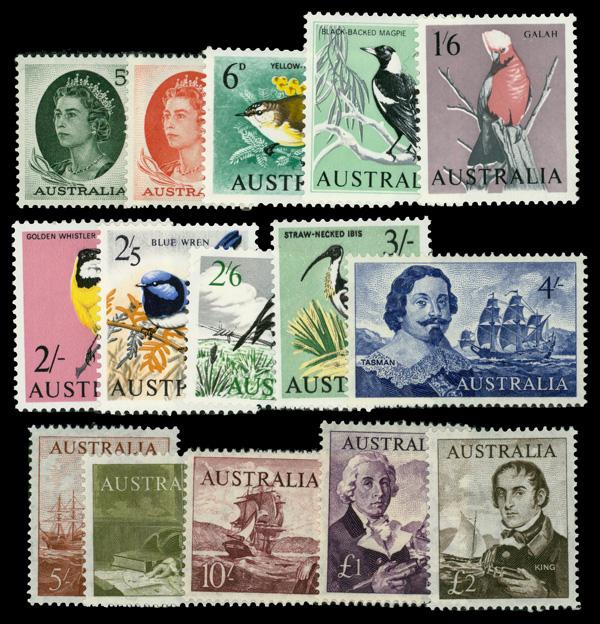 1963-65, Birds & Navigators, 5d to £2 complete (Scott 365-379), Fine to Very Fine. SG 354/360, 363/369; £132 ($170). Scott $245. (Image)