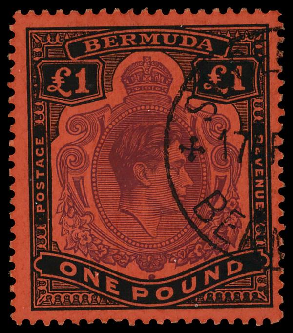 1951, King George VI, £1 deep reddish purple & black on pale red, perf. 13 (Scott 128), Very Fine to Extremely Fine. SG 121c. Scott $43. (Image)