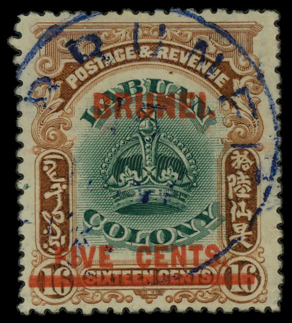 1906, "BRUNEI" on Labuan 5¢ on 16¢ green & brown (Scott 6), single, Fine to Very Fine. SG 16. Scott $90. (Image)