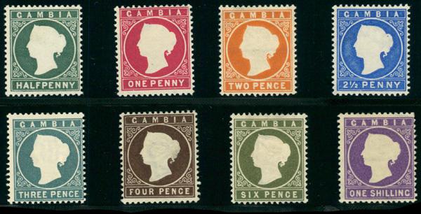 1886, Queen Victoria, Embossed, ½d to 1s complete (Scott 12-19), Crown CA watermark sideways, o.g., lightly hinged or hinge remnant, Fine to Very Fine. SG 21/36. Scott $92. (Image)
