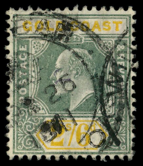 1906, King Edward VII, 2s6d green & yellow (Scott 55), Multiple Crown CA watermark; pulled perf at top, Fine to Very Fine. SG 57. Scott $140. (Image)