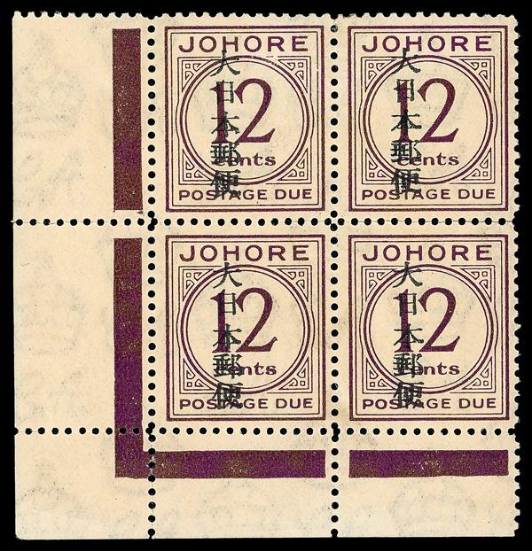 Postage Dues, 1943, 1¢-12¢ complete (Scott NJ6-NJ10), complete set of blocks of 4, #NJ9 and NJ10 some separations, o.g., lightly hinged twice with some hinge remant and tropicalized, Very Fine. SG JD6/JD10; £201 ($260). Scott $194. (Image)