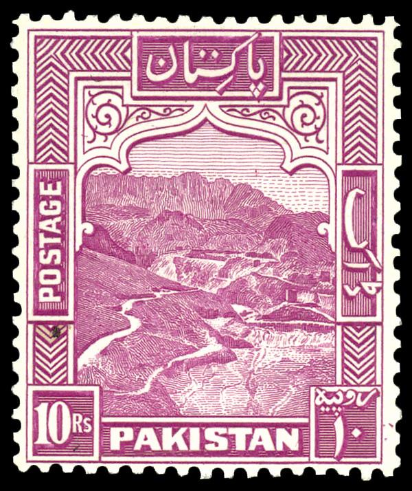 1948, Khyber Pass 10r rose lilac (Scott 41b), single, o.g., never hinged, Very Fine, tiny paper imperfection. Scott $130. (Image)